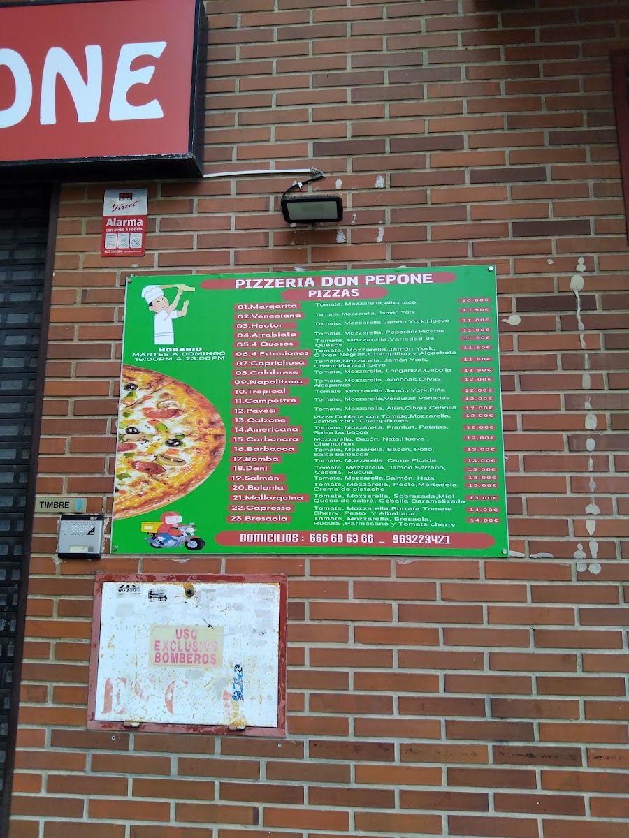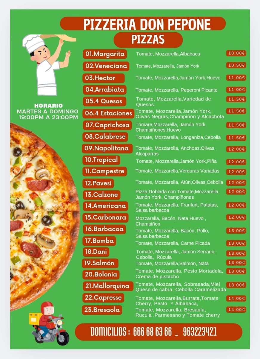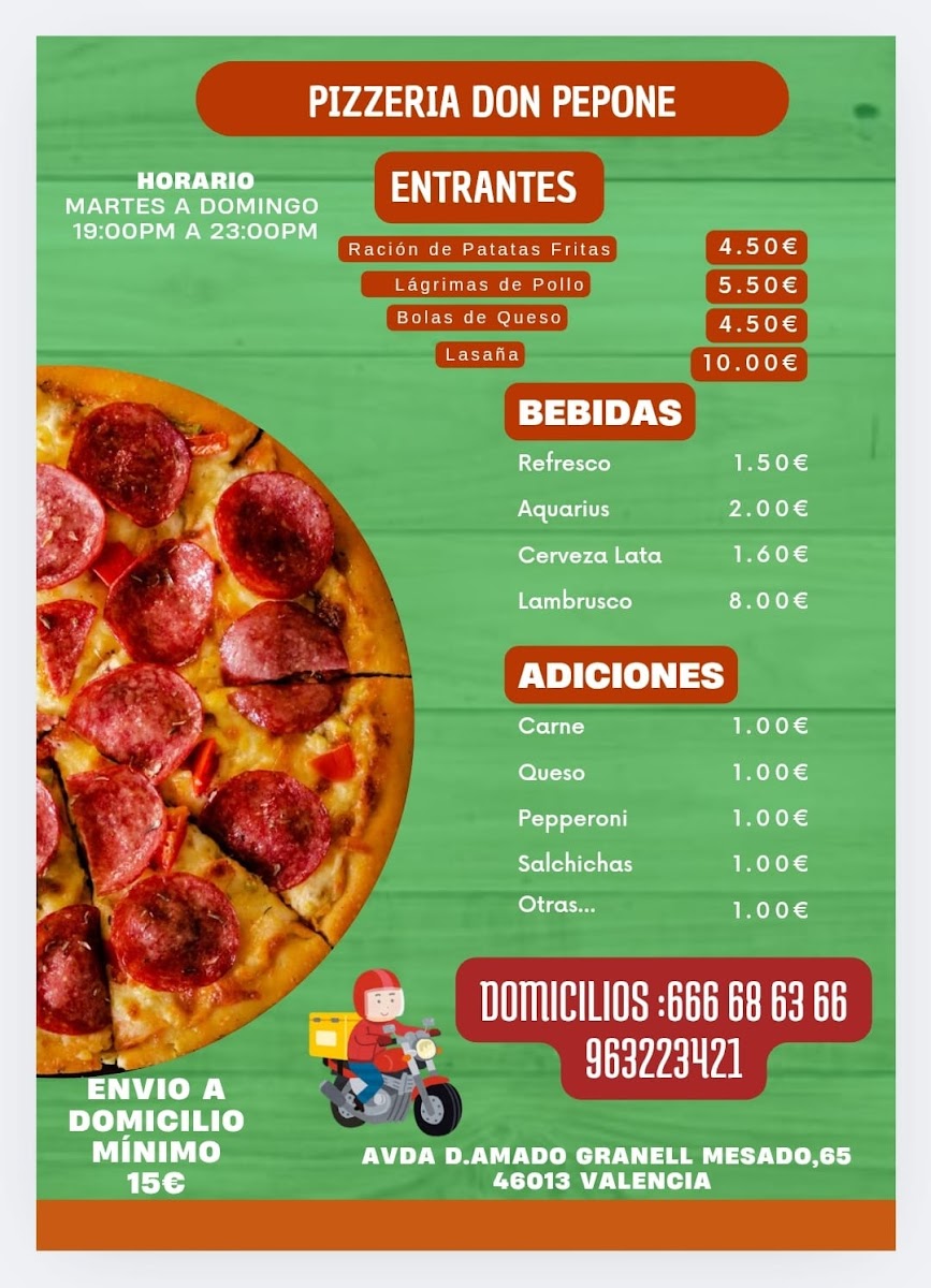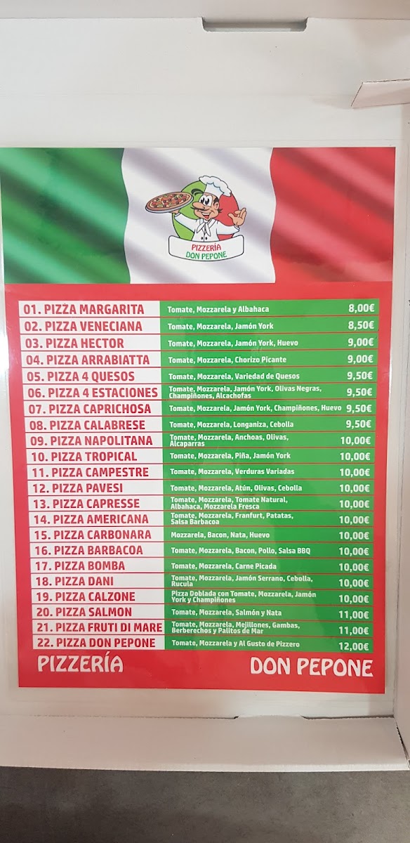 Don Pepone offers a diverse and inviting menu that captures the essence of Italian cuisine, with a special focus on freshly made pizzas. The Margarita pizza stands out as a classic, with a simple yet delicious combination of tomato, mozzarella, and basil, making it a perfect choice for purists. For those looking for a more varied experience, the Pizza 4 Estaciones is an excellent pick, offering a delightful mix of seasonal toppings that change with the seasons, ensuring fresh flavors year-round. The restaurant's menu also features a range of other Italian staples, with each dish crafted to provide an authentic taste of Italy. The balance of traditional and seasonal ingredients on the menu makes Don Pepone a great destination for both familiar favorites and seasonal innovations, ensuring a satisfying meal for any palate.