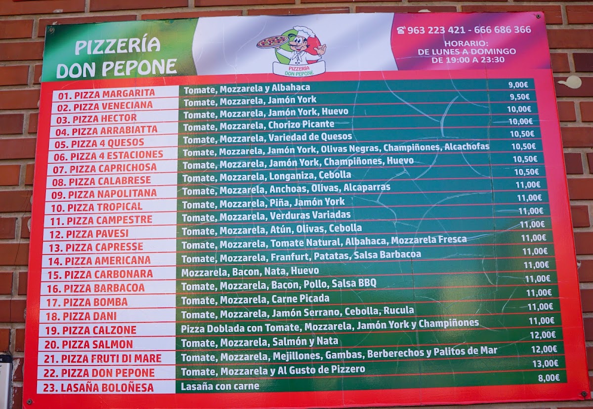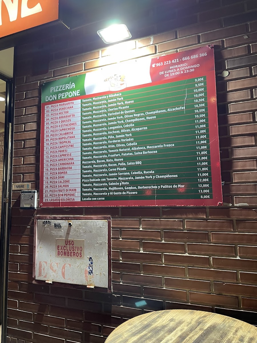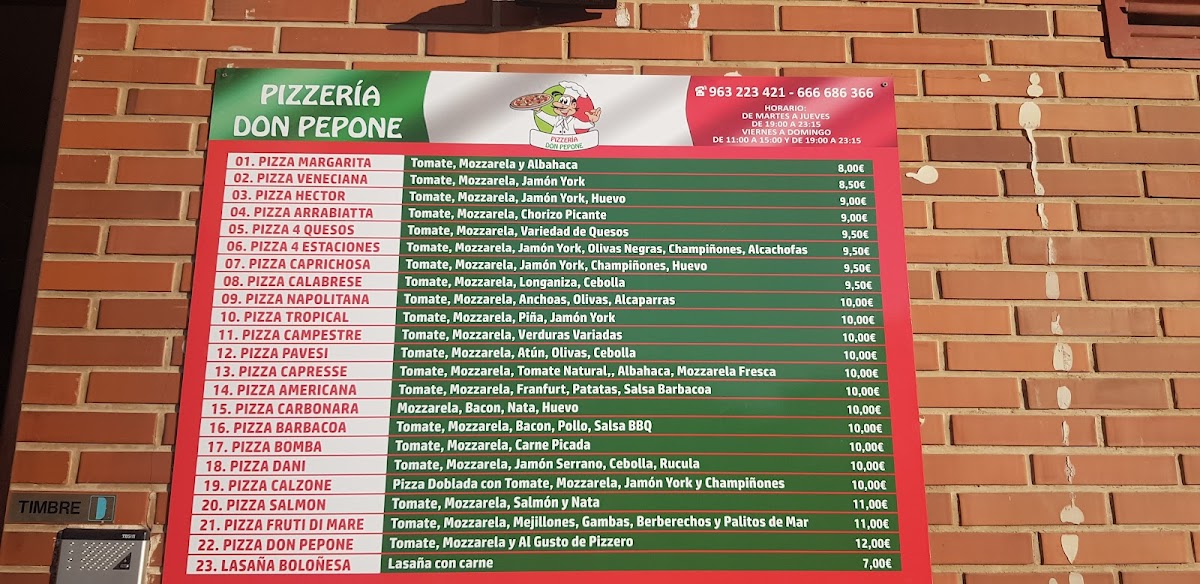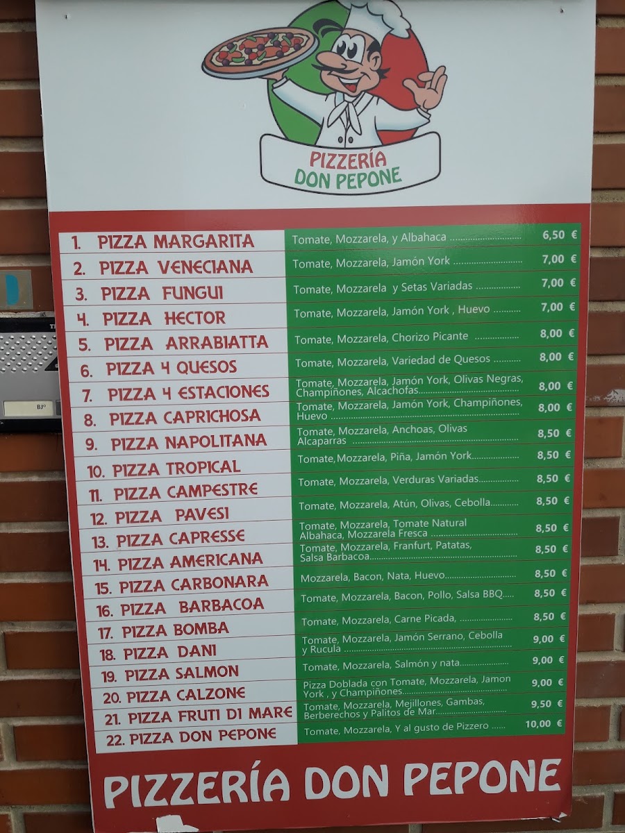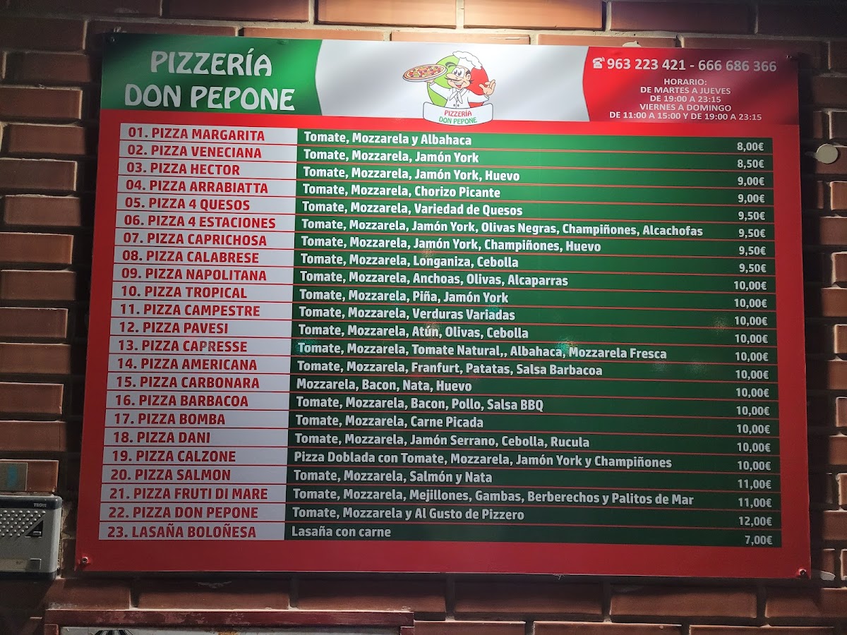Don Pepone offers a diverse and inviting menu that captures the essence of Italian cuisine, with a special focus on freshly made pizzas. The Margarita pizza stands out as a classic, with a simple yet delicious combination of tomato, mozzarella, and basil, making it a perfect choice for purists. For those looking for a more varied experience, the Pizza 4 Estaciones is an excellent pick, offering a delightful mix of seasonal toppings that change with the seasons, ensuring fresh flavors year-round. The restaurant's menu also features a range of other Italian staples, with each dish crafted to provide an authentic taste of Italy. The balance of traditional and seasonal ingredients on the menu makes Don Pepone a great destination for both familiar favorites and seasonal innovations, ensuring a satisfying meal for any palate.